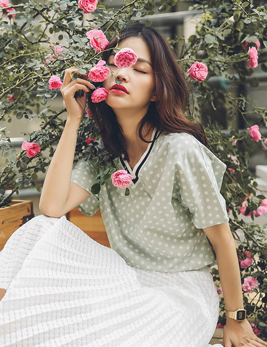 小维2016夏季新款简约清新波点印花V领宽松衬衫女五分袖纯色衬衣|1c1aff