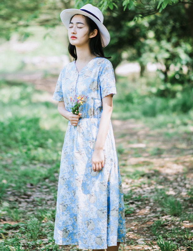 梅子熟了 2016夏新款 文艺范中长款印花连衣裙 复古V领短袖长裙女|1c1ecn