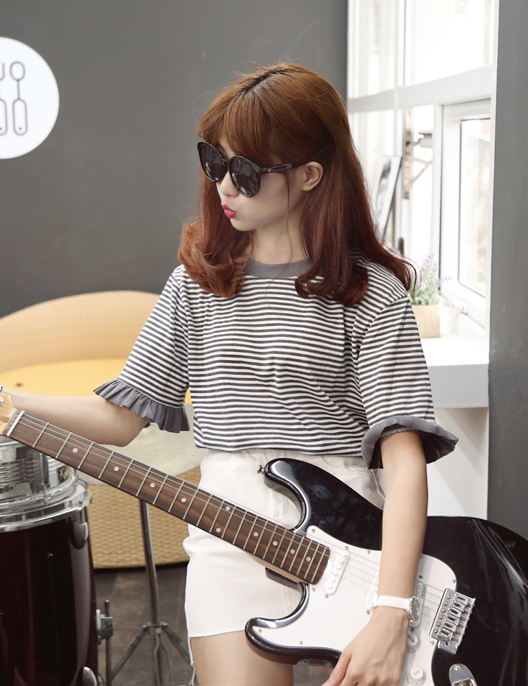 【Anli-style】拼接荷叶袖 简单百搭 必入的圆领条纹Tee|1c1f97