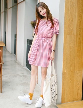 学院风修身连衣裙夏季新款花瓣袖韩版甜美系带蝴蝶结格子短款裙子|1c1fd0